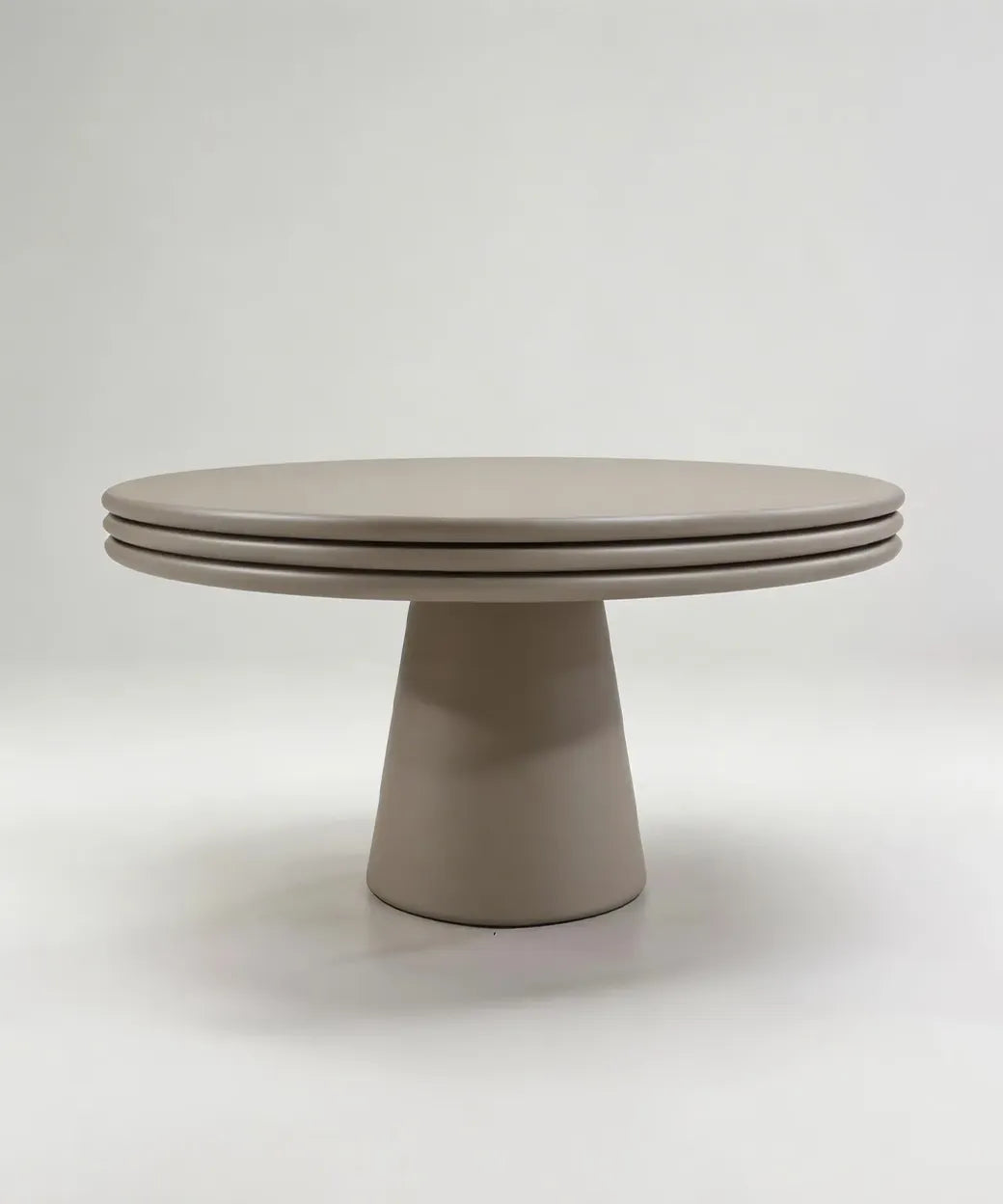 La mesa Caleta es una pieza de líneas depuradas y estética minimalista, donde la suavidad de las formas y la pureza del color se convierten en protagonistas. Su diseño se articula mediante un pedestal troncocónico central que sostiene un sobre circular con un elegante juego de molduras horizontales superpuestas, aportando profundidad y carácter sin recurrir a excesos decorativos.
