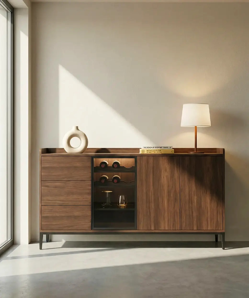 El aparador Garafía combina diseño contemporáneo, funcionalidad avanzada y una estética sobria, pensado para quienes buscan una pieza elegante con un plus de utilidad. Fabricado con estructura de madera maciza y tablero multicapa macizo chapado en nogal, ofrece una presencia sólida, refinada y duradera.