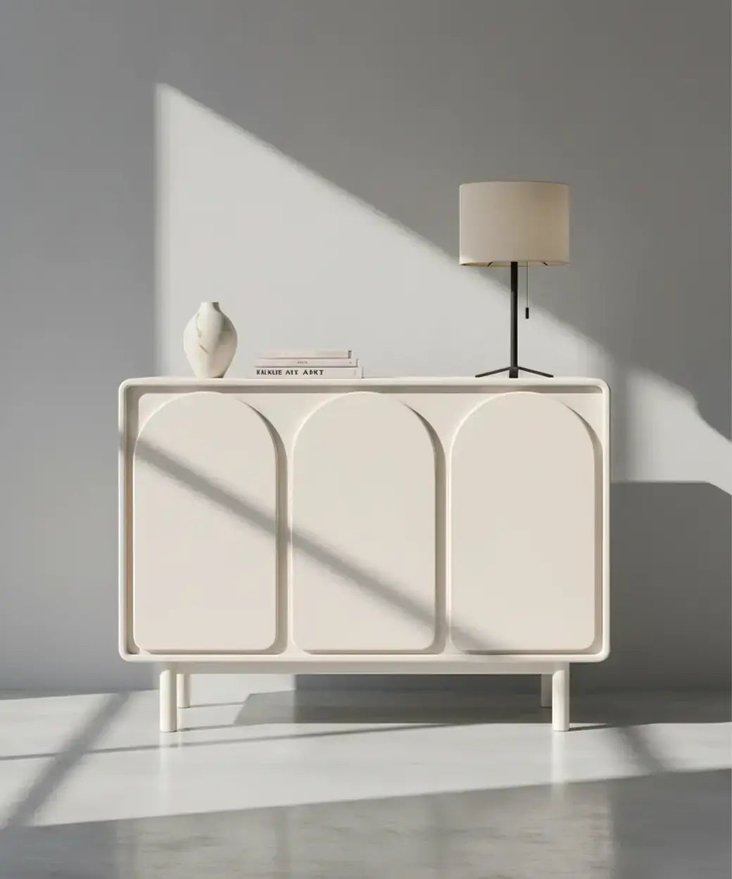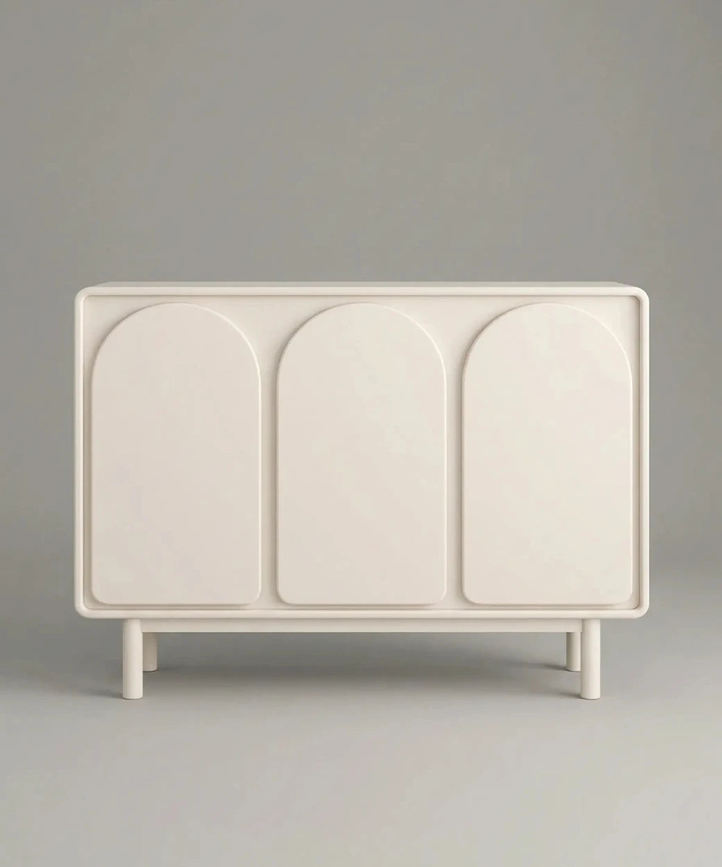 Su frontal se define por una elegante composición de puertas con arcos redondeados, un detalle visual que suaviza el conjunto y aporta un carácter contemporáneo muy refinado. Esta repetición de formas curvas genera ritmo y armonía, convirtiendo al aparador Jedey en una pieza sobria pero con identidad propia. El acabado en blanco refuerza su estética luminosa y atemporal, facilitando su integración en interiores modernos, minimalistas o de inspiración mediterránea.