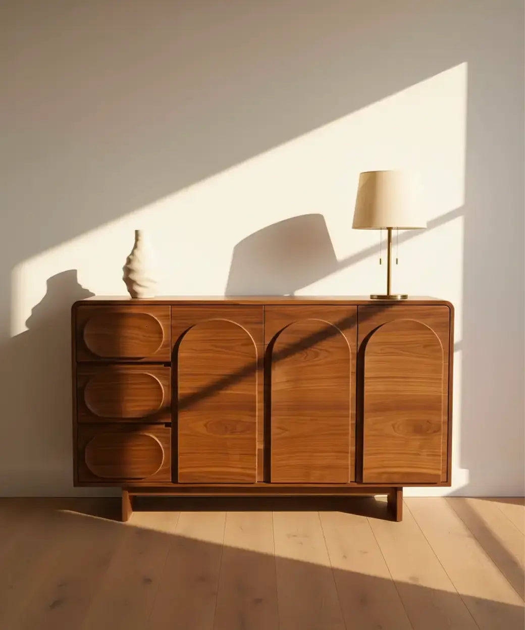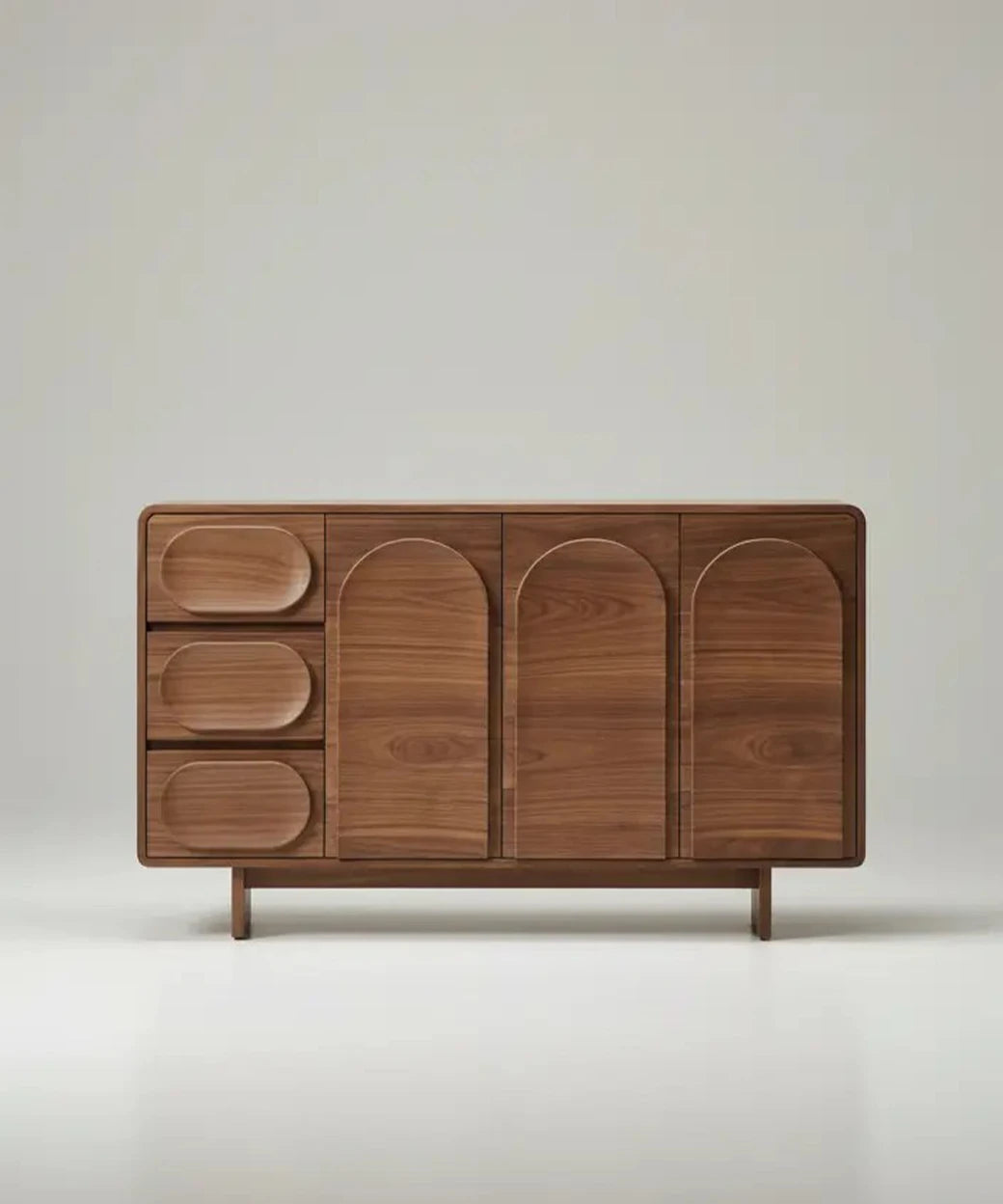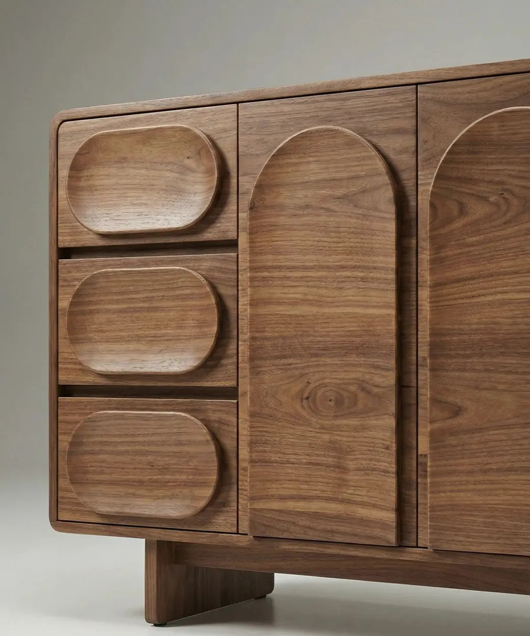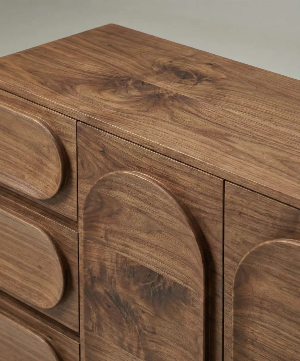 Lo que define al aparador Malva es su frontal escultórico, protagonizado por un elegante juego de puertas con arcos redondeados y cajones con relieves ovalados, que aportan profundidad y un ritmo visual único. Estas formas curvas suavizan el conjunto y generan un diseño envolvente, muy equilibrado y distintivo, que lo convierte en una pieza protagonista dentro del espacio. La continuidad de la veta del nogal refuerza su carácter natural y artesanal.
