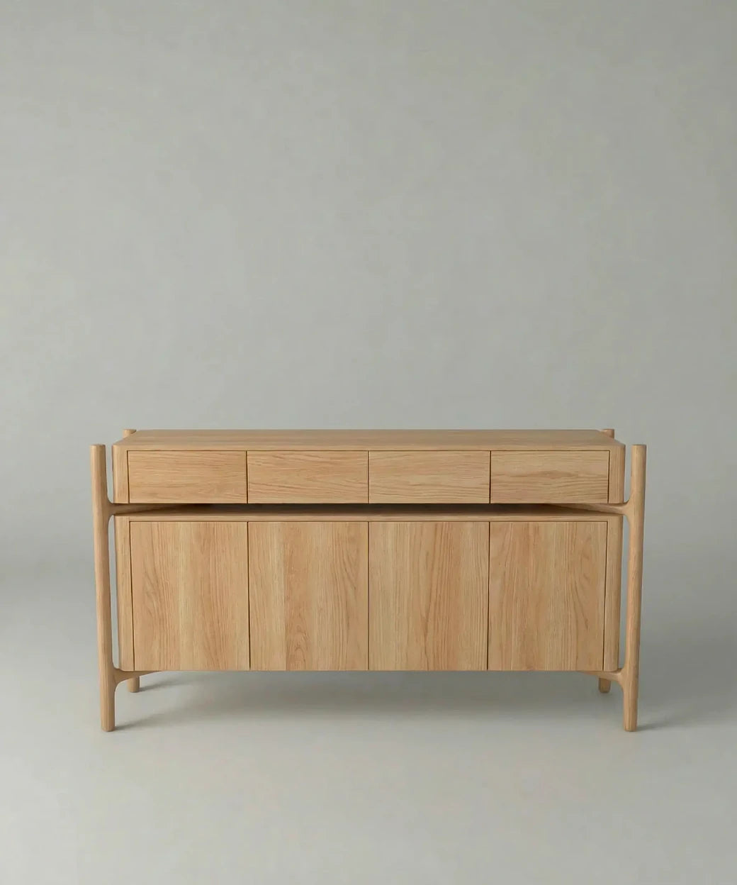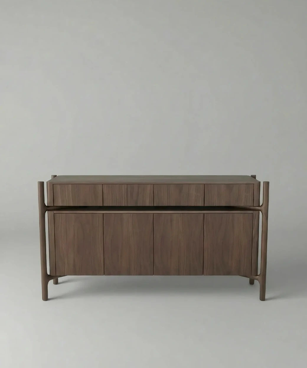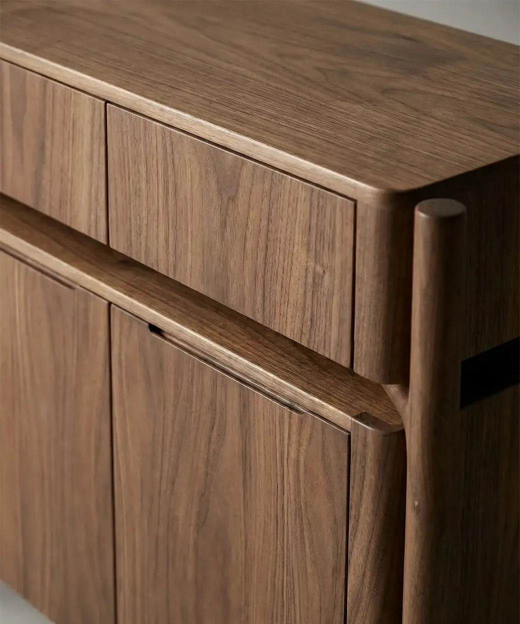 Visualmente, Manso destaca por su diseño sereno y bien proporcionado, con una composición de dos niveles de puertas que aporta orden y equilibrio al frontal. Las vetas verticales del nogal refuerzan su carácter natural y sofisticado, mientras que la estructura envolvente con patas redondeadas y líneas suavemente curvadas aporta ligereza visual y un lenguaje contemporáneo muy refinado, alejándose de diseños rígidos o excesivamente geométricos.