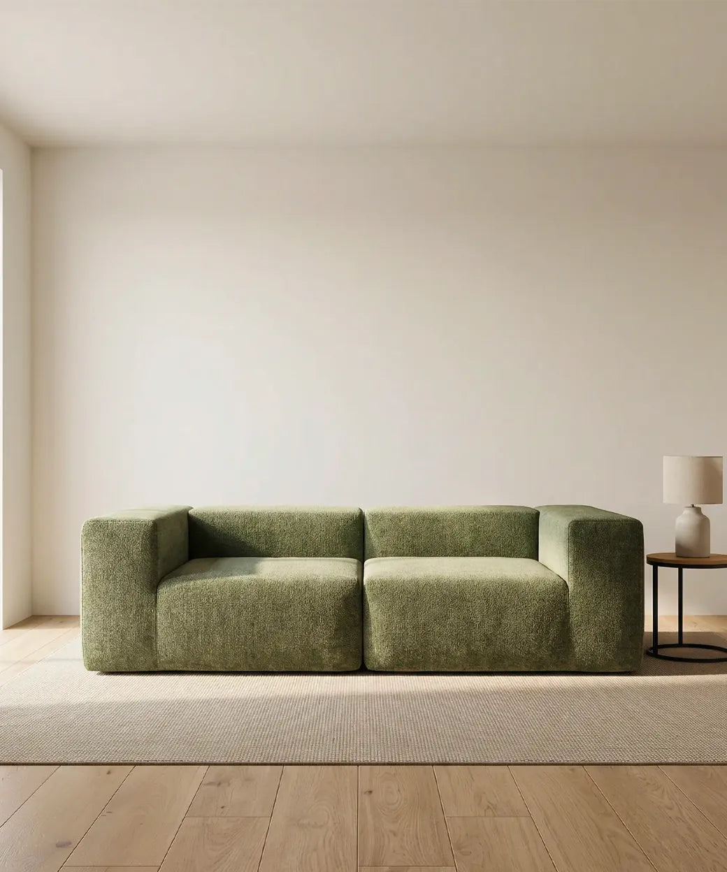 Disponible en tela verde selva y pana marrón tierra, Naos aporta carácter y calidez al espacio. La textura del tapizado realza el volumen del sofá y añade profundidad visual, convirtiéndolo en una pieza protagonista tanto en salones modernos como en ambientes de inspiración natural o minimalista. Sus líneas rectas y proporciones generosas facilitan su integración en distintos estilos decorativos.