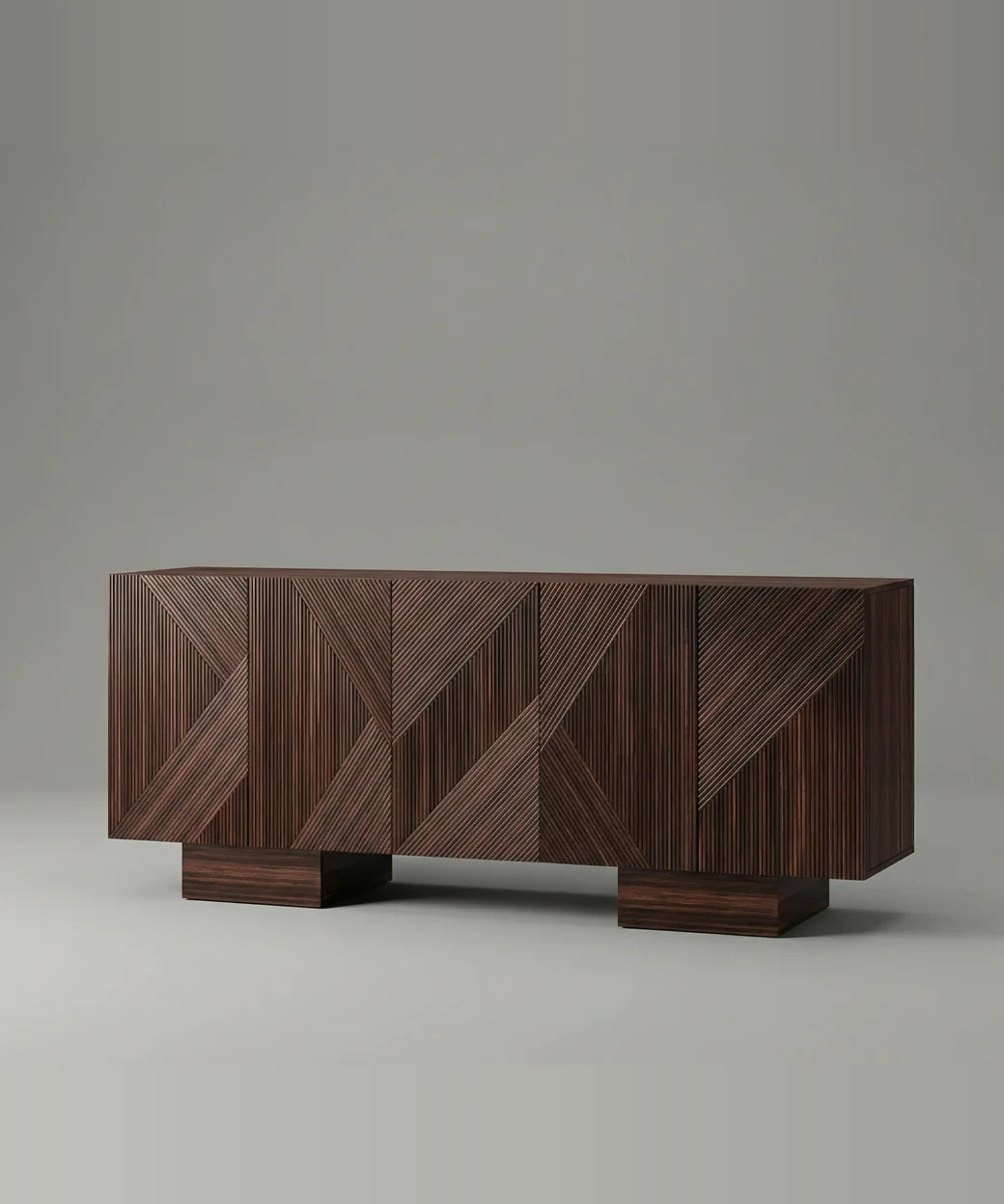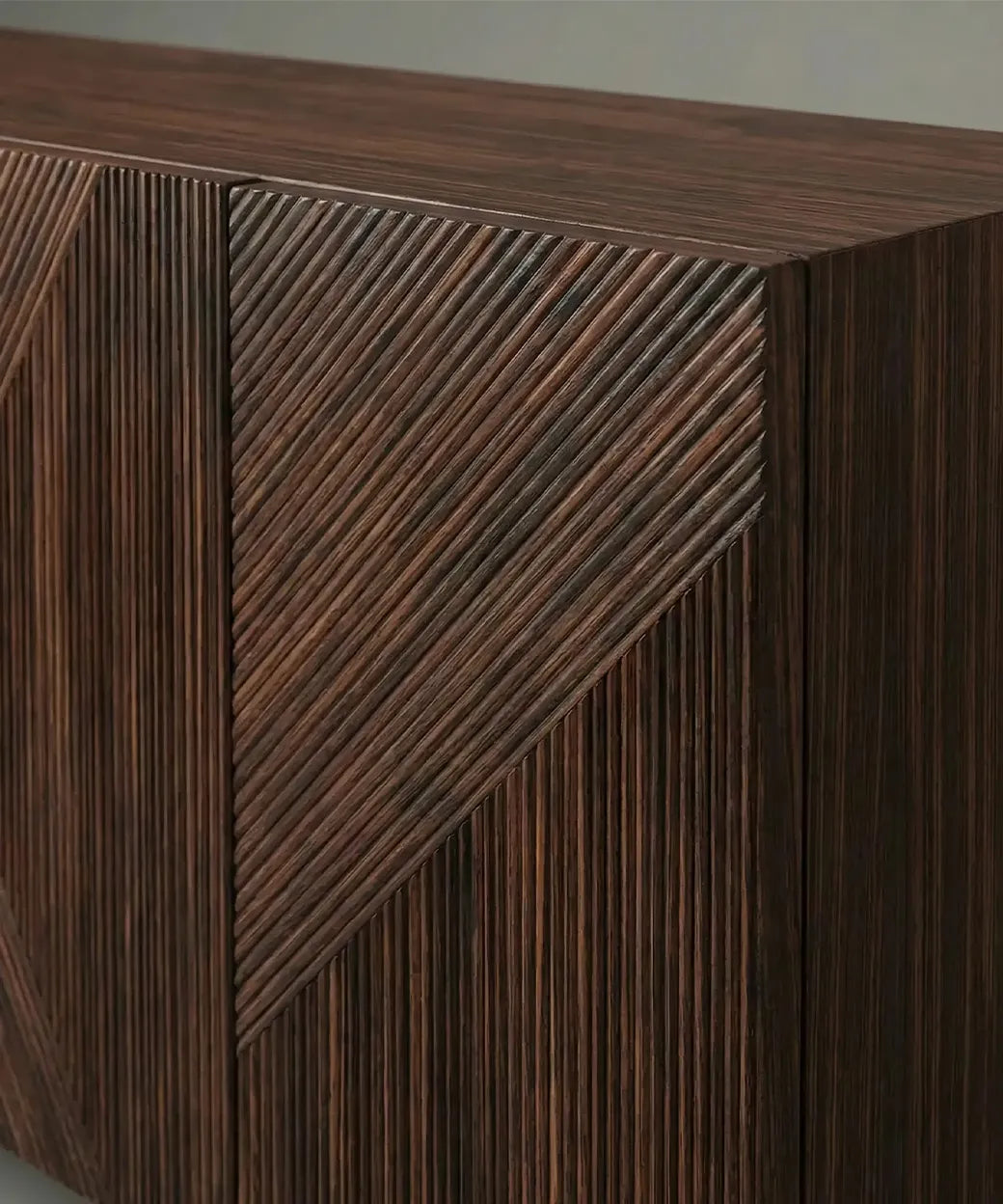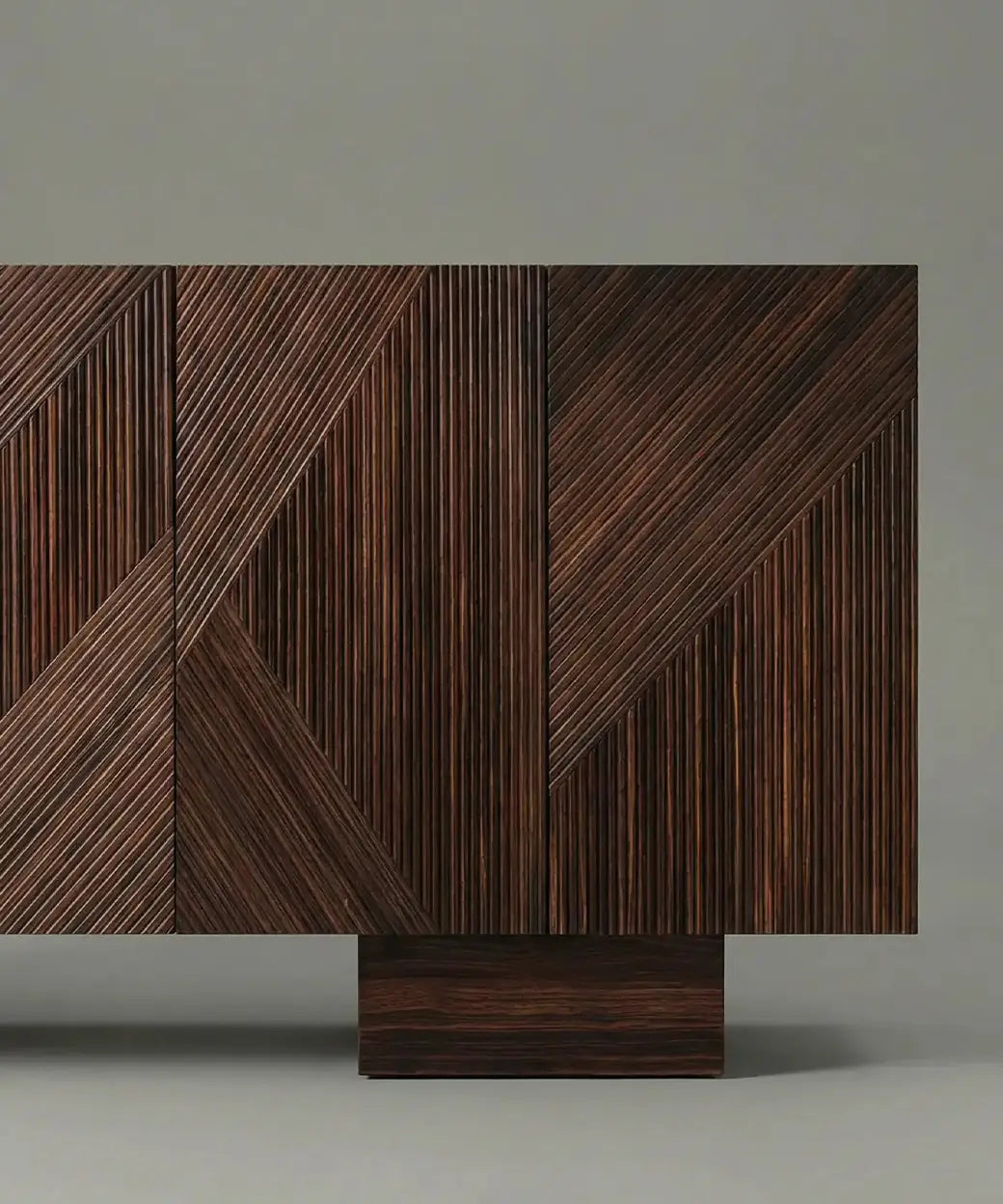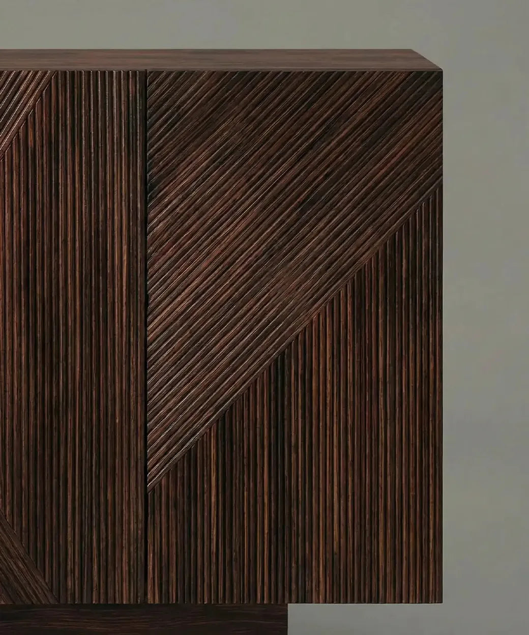 Su rasgo más distintivo es el frontal texturizado, compuesto por un sofisticado juego de listones verticales y planos diagonales que se cruzan formando patrones geométricos dinámicos. Este relieve crea un efecto de profundidad y contraste muy marcado, donde la luz interactúa constantemente con la madera, aportando riqueza visual y un acabado casi escultórico. El tono oscuro del nogal refuerza su elegancia y subraya la precisión del trabajo de fresado.