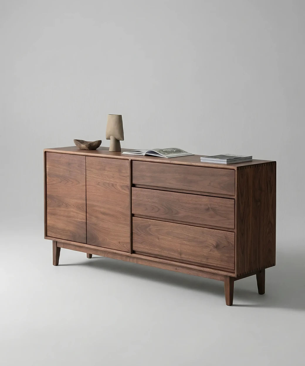 El aparador Verodal es una pieza que apuesta por la simplicidad bien entendida, donde la madera y la proporción son las verdaderas protagonistas. Fabricado con estructura de madera maciza y tablero multicapa macizo chapado en nogal, ofrece una combinación equilibrada de resistencia, calidez y diseño duradero.