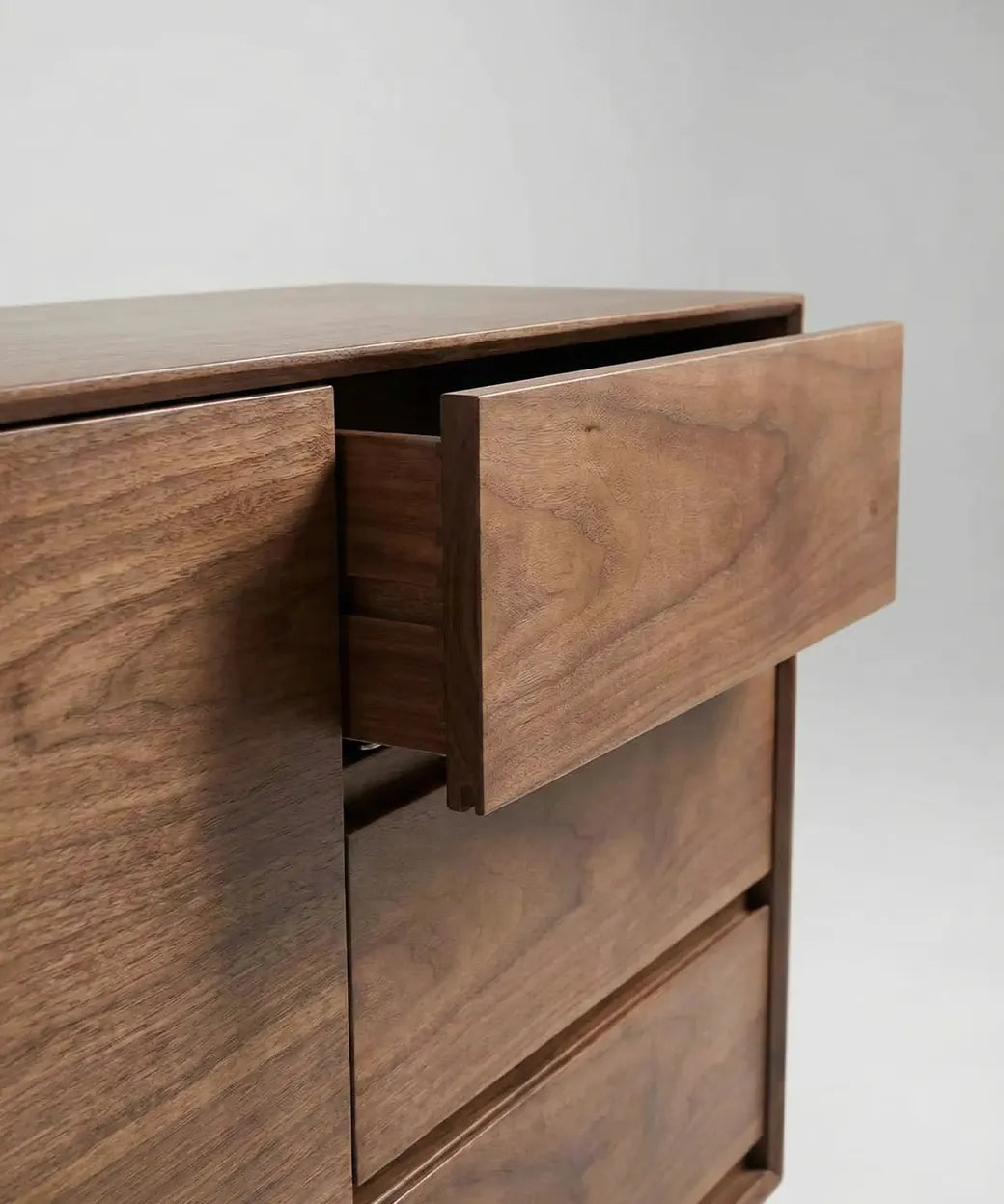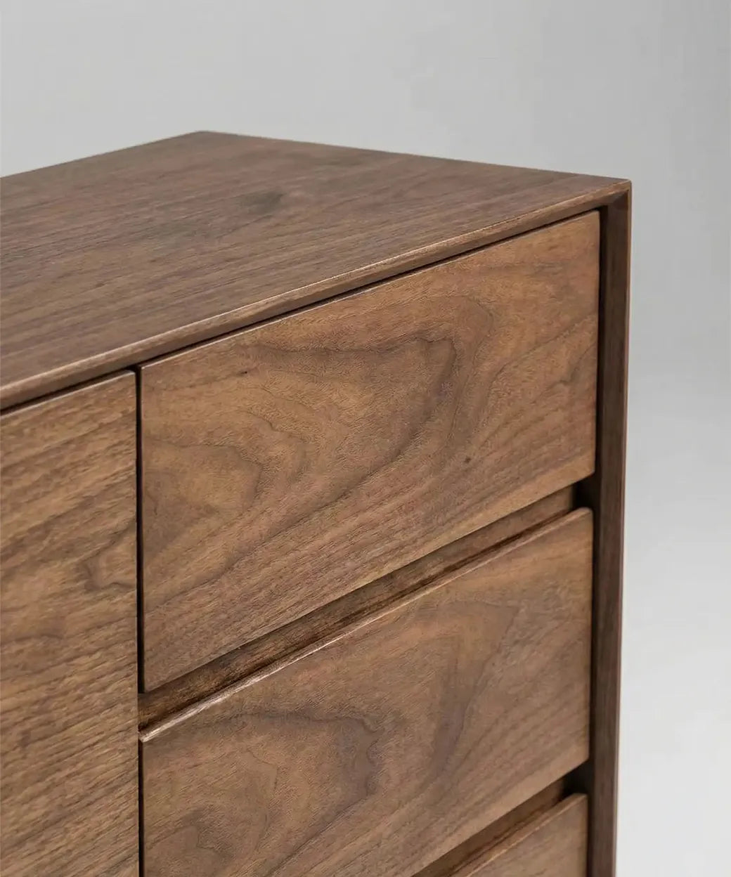 Su diseño se caracteriza por un frontal limpio y ordenado, en el que conviven puertas amplias de veta continua con un módulo lateral de cajones integrados, creando una composición práctica y visualmente muy serena. La ausencia de elementos superfluos refuerza su estética atemporal, permitiendo que la veta natural del nogal aporte profundidad y carácter al conjunto. Las líneas rectas y bien definidas transmiten una sensación de equilibrio y sobriedad muy elegante.